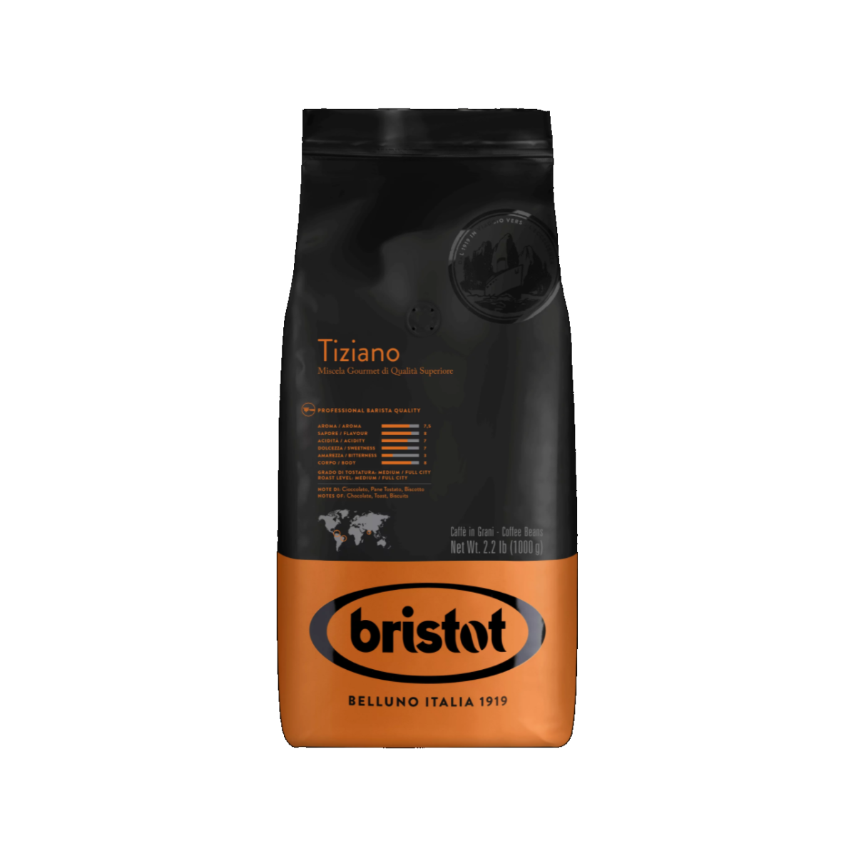 Bristot Tiziano je vrcholná směs káv vyznačující se rafinovaně intenzivní až dekadentní vůní a plným a hladkým tělem. Dokonale kombinuje čokoládové tóny a karamelou chuť s krémově čokoládovou dochutí.