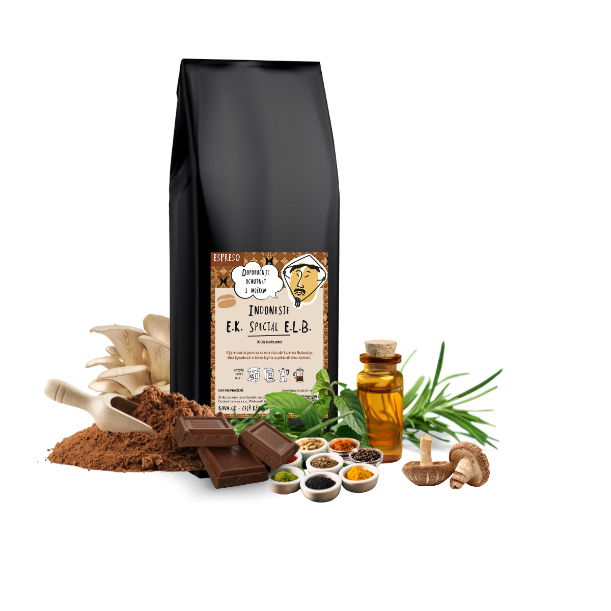 S Indonésií E.K. Special E.L.B. je to jako s koprovkou, buď si jí zamilujete, nebo ji nenávidíte. Jak to u robusty bývá, není vůbec kyselá a má specifickou zemitou chuť, kterou ale perfektně doplňuje intenzivní kořeněné aroma a stopy bylin a exotických hub. Doporučujeme ji ochutnat jak čistou jako klasické espreso, nebo ji malinko naředit mlékem a udělat si kapučíno, nebo třeba macchiato.