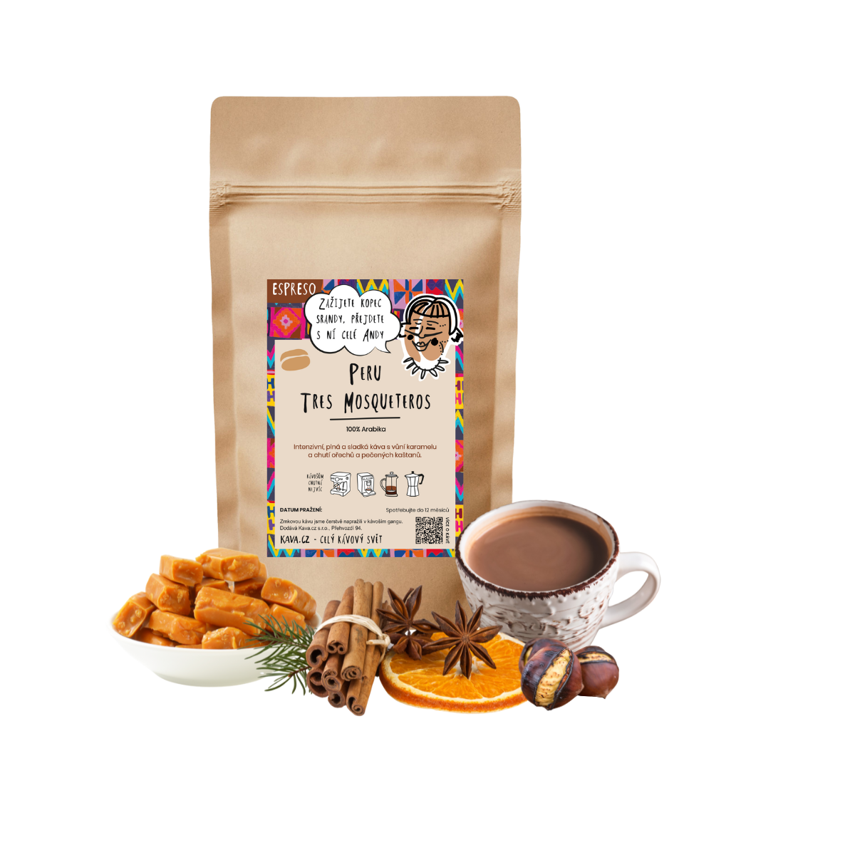 Čestné kávošské, že Peru Tres Mosqueteros je ta nejkakaovější káva, kterou jste kdy ochutnali. Má plné těžší tělo a hodně výraznou chuť, která jde spíš malinko do hořka, než do kysela – připomíná oříšky a pečené kaštany. Voní hezky sladce po karamelu a na espresu dělá jemnou světlou cremu. Zkrátka dokonalá ranní vzpruha i odpolední kofeinový nakopávák pro těžké dny v práci.