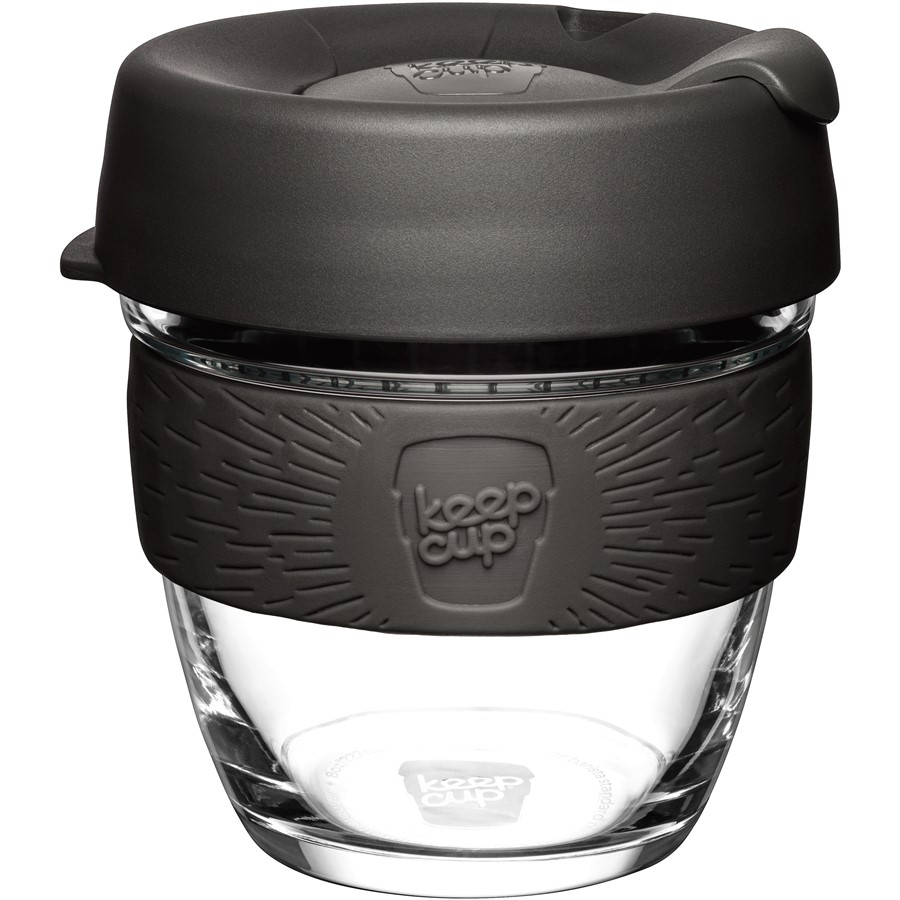 Skleněný kelímek pro vaši kávu s sebou z řady KeepCup BREW v tmavě šedé kombinaci. Velikost S.