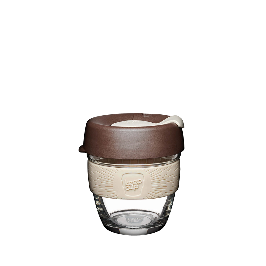 Skleněný kelímek pro vaši kávu s sebou z řady KeepCup BREW v barvách mléčné a bílé čokolády. Velikost S.