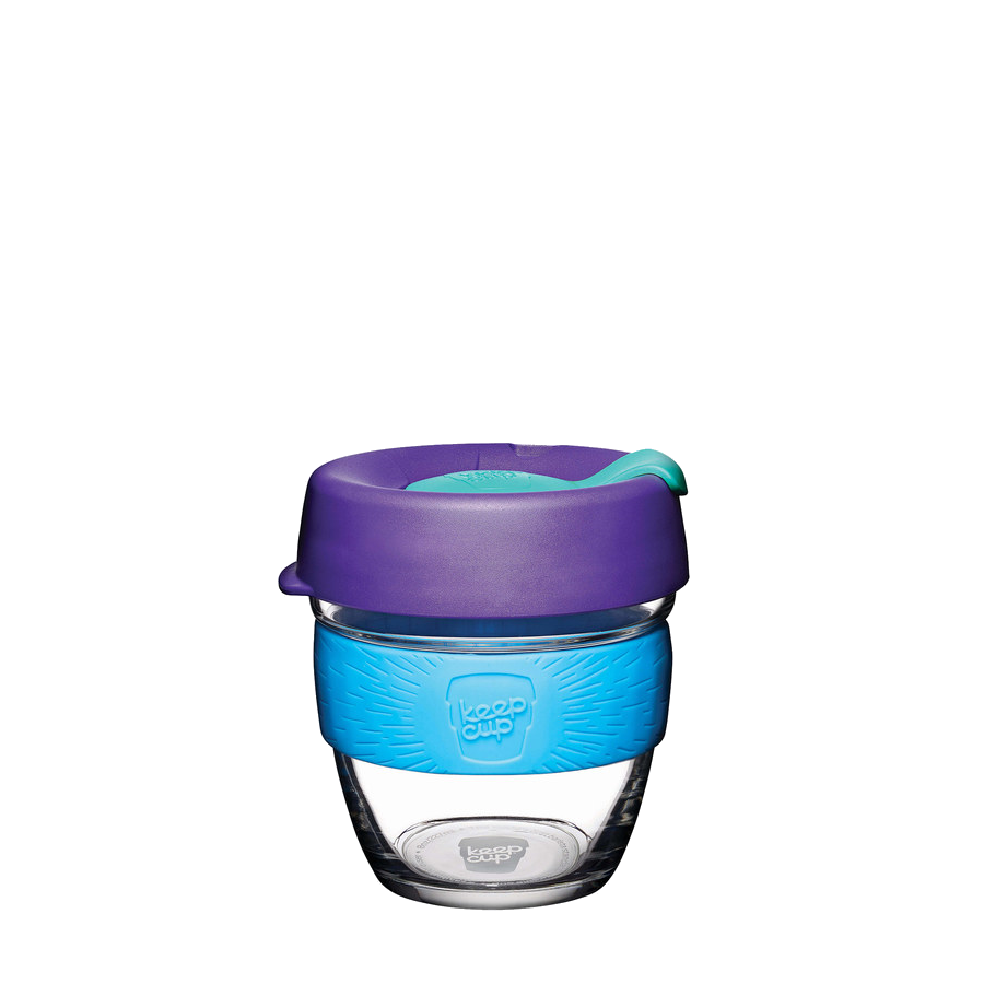 Skleněný kelímek pro vaši kávu s sebou z řady KeepCup BREW ve veselé tyrkysovo fialové. Velikost S.