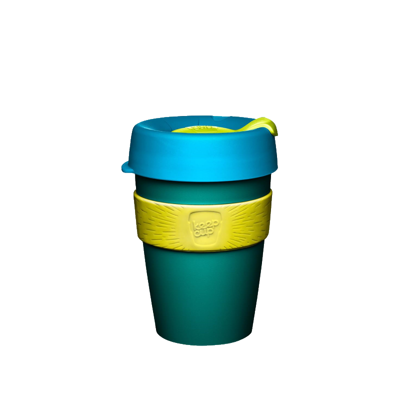 Plastový kelímek na cesty z řady KeepCup ORIGINAL v modré, žluté a tmavě zelené barvě. Velikost M.