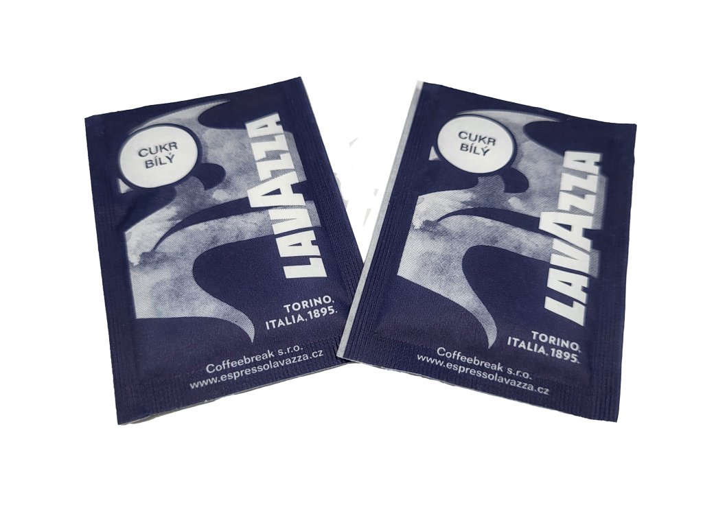 Hygienicky balený bílý cukr s logem Lavazza. Vhodný pro kanceláře či restaurace.