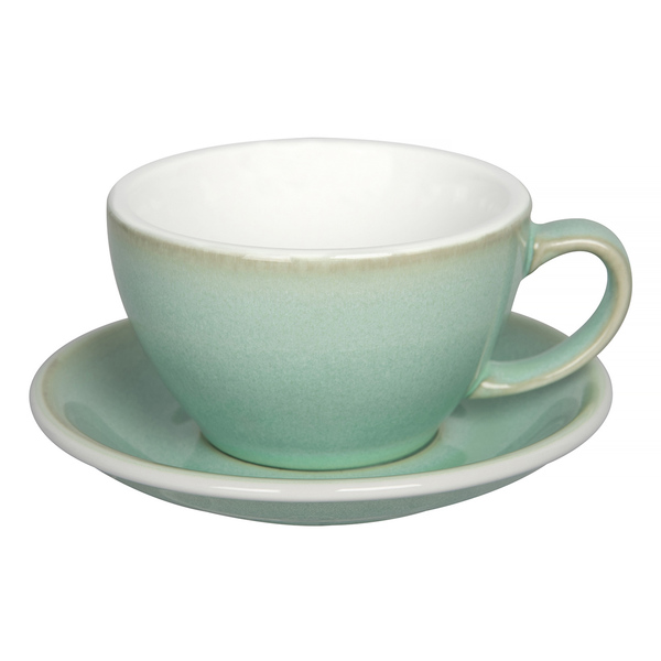 Silnostěnný porcelánový šálek s podšálkem na caffé latte nebo čaj s jedinečnou glazurou v barvě bazalky.