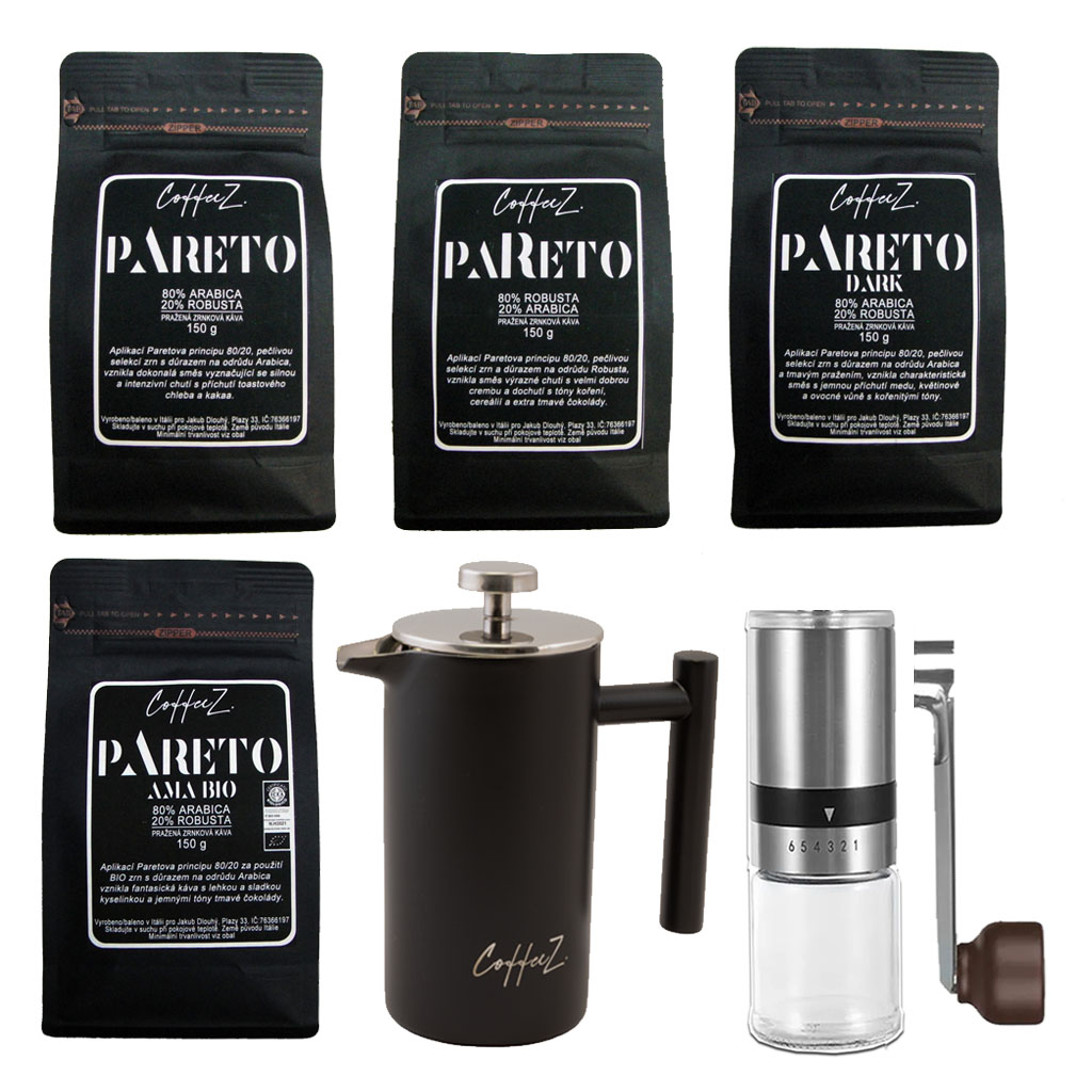 PARETO - Degustační balíček 4x150 g s MLÝNKEM & FRENCH PRESSEM 350 ml