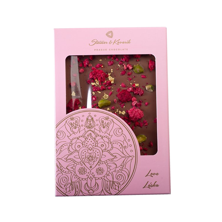 Kvalitní ručně dělaná mléčná čokoláda s mandalou z kandovaných květů růží, lyofilizovaných malin, pistácií a jedlého 23 kt zlata. Je to víc než jen čokoláda, spolu s ní totiž dáváte také energii lásky, která je vložena do ručně malovaného obrázku mandaly. Darujte lásku!