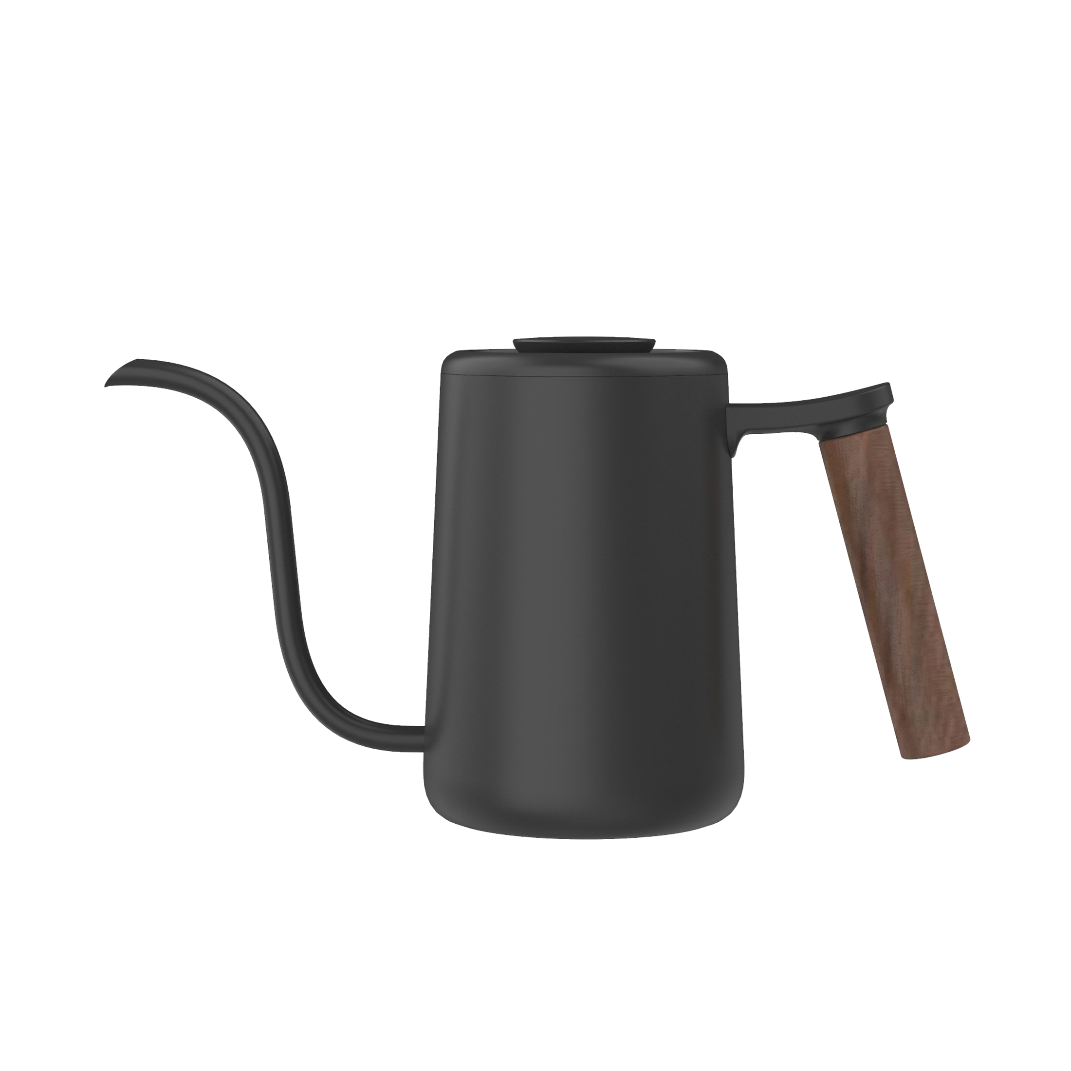 Osobitá varná konvice v matné černé s dřevěným ouškem a patentovanou hubičkou pro snadné nalévání.