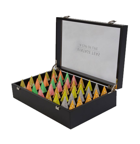 Pokud nabízíte pyramidové čaje svým zákazníkům, zvažte jejich prezentaci v černé dřevěné kazetě s průhledným víkem. Vypadá to stylově.