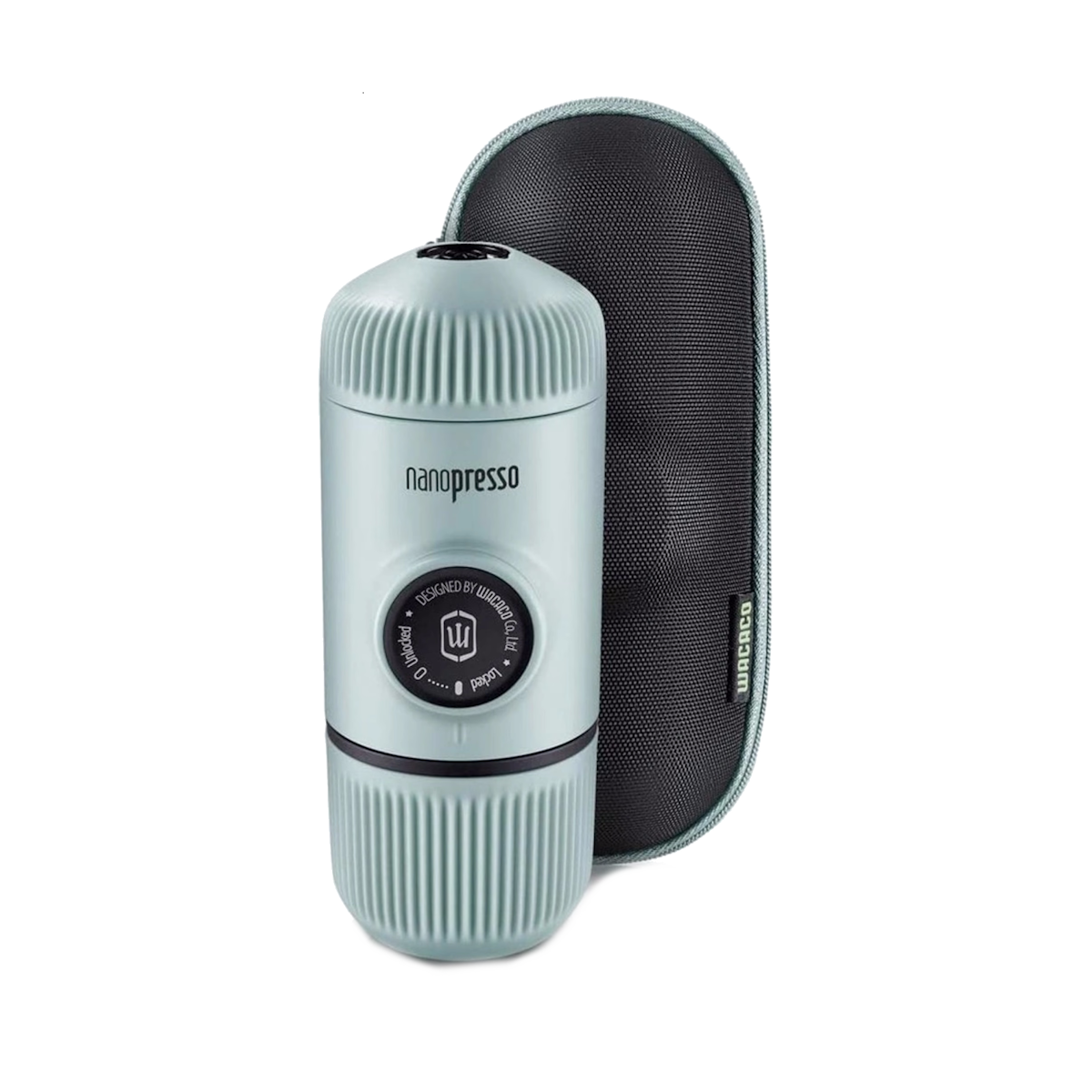 Cestovní šedomodrý kávovar pro přípravu espresa bez použití elektrické energie včetně pevného cestovního pouzdra. Stačí horká voda v termosce a oblíbená káva.