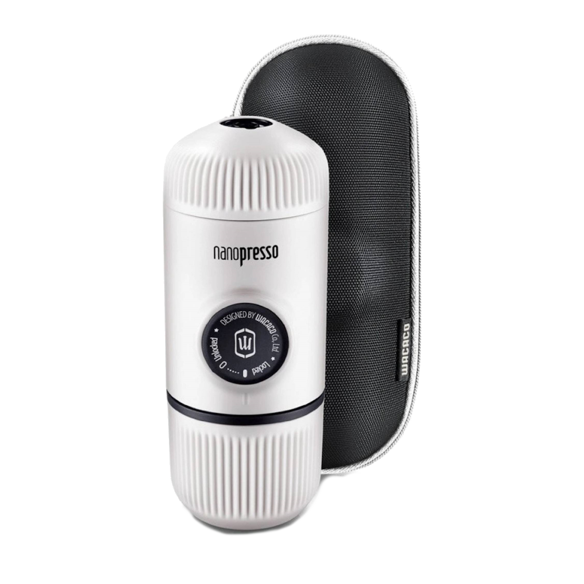 Cestovní kávovar v cool bílé barvě pro přípravu espresa bez použití elektrické energie včetně cestovního obalu. Stačí horká voda v termosce a oblíbená káva.