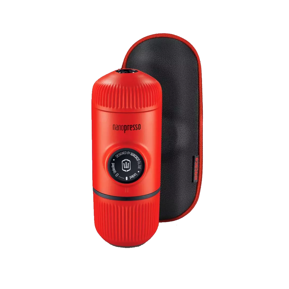 Cestovní kávovar v červené barvě pro přípravu espresa bez použití elektrické energie s cestovním pevným obalem. Stačí horká voda v termosce a oblíbená káva.