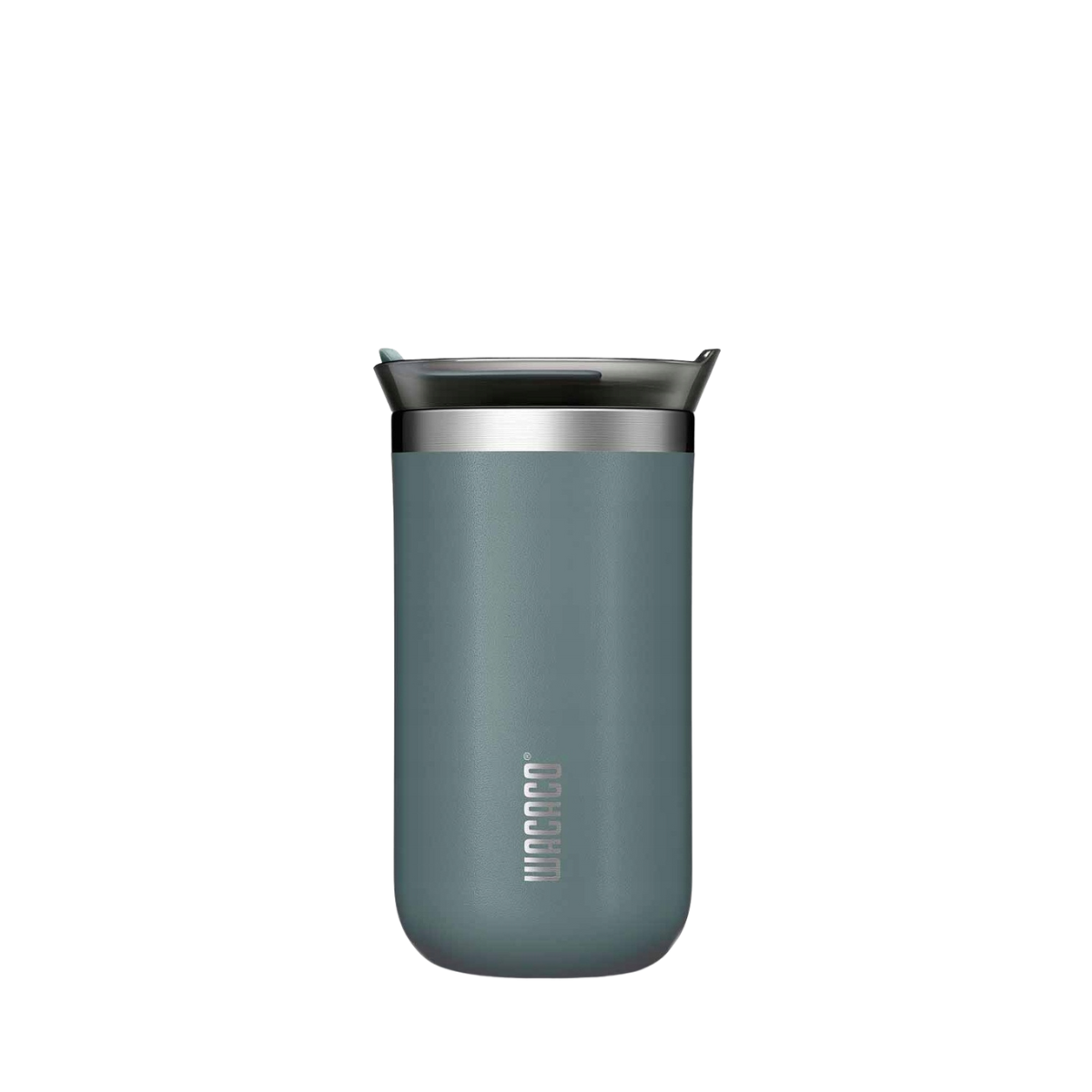 Středně velký cestovní termohrnek Wacaco z nerezové oceli s vakuovou izolací a šroubovacím uzávěrem.