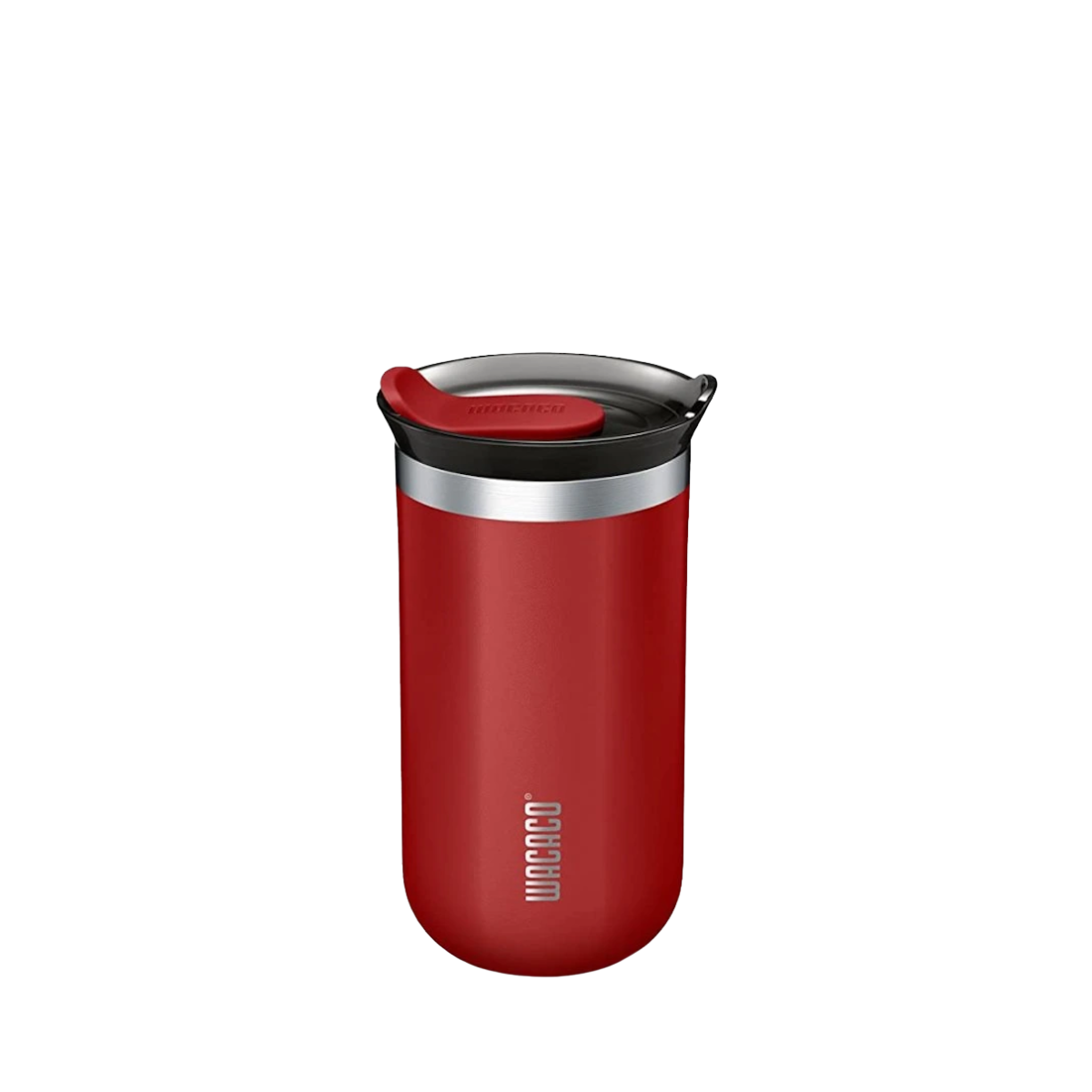 Středně velký cestovní termohrnek Wacaco z nerezové oceli s vakuovou izolací a šroubovacím uzávěrem.