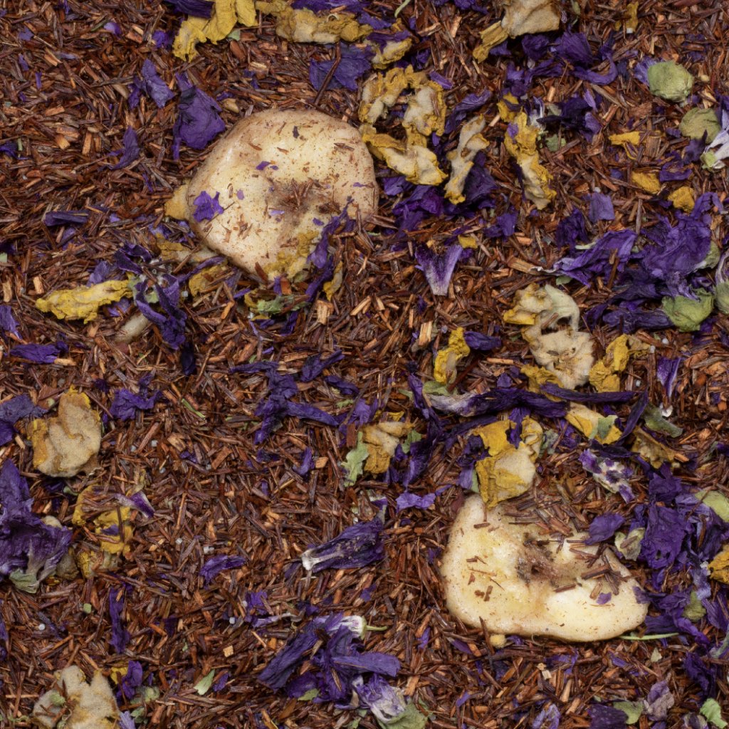 Kvalitní rooibos s banánem, květy divizny a slézu. Čaj z naší prémiové řady • OVONĚNÁ ŽABAKA • (čaje se zvýšeným podílem nedoslazovaného ovoce a zcela přírodními aromaty).